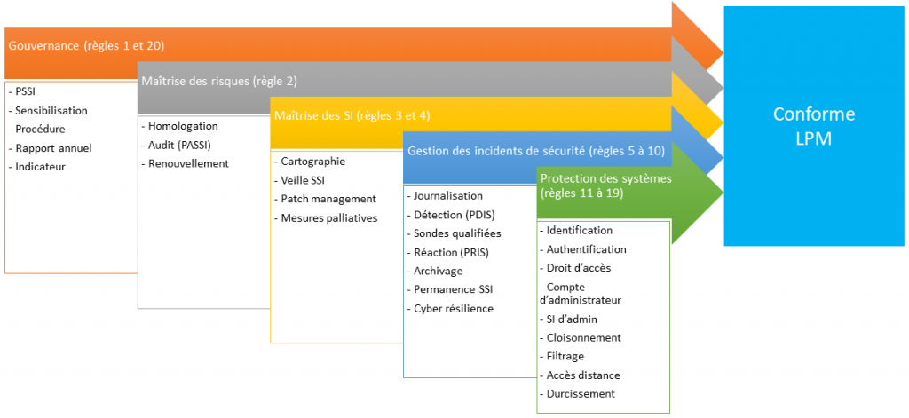 Les arrêtés de la loi de programmation militaire prévoient un délai variant de 3 mois à 2 ans pour mettre en place les mesures de mise en conformité des SIIV. Ces mesures sont listées dans la loi, au nombre de 20, et regroupées en fonction des thématiques de mise en conformité présentées ci-dessous :